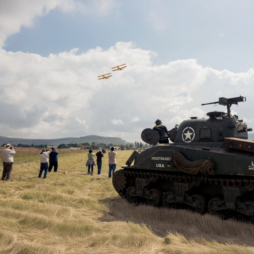 - Run-pasts near the airstrip, with vintage aircraft staged, landing, and taking off